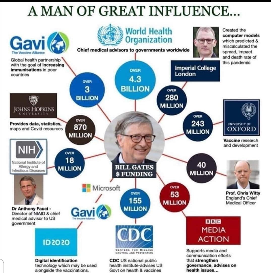 Tous impliqués dans des projets de vaccination contre le Covid 19, des projets à plusieurs milliards de dollars de bénéfice et, si l'on en croit certains milieux bien informés, un prétexte pour mettre en place une série de mesures inavouables (contrôle des populations, eugénisme, hold-up financier mondial) (15).