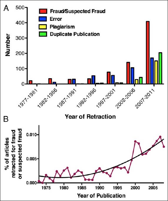 Publiée en octobre 2012, Ferric Fang, Grant Steen et Arturo Casadevall ont publié une étude parue dans les comptes-rendus de l'Académie américaine des sciences (PNAS) estime que le taux de rétractation liée à une fabrication et une falsification de données a été multiplié par dix depuis 1975. Rappelons que ces deux raisons caractérisent la fraude, la forme la plus grave d'inconduite scientifique.