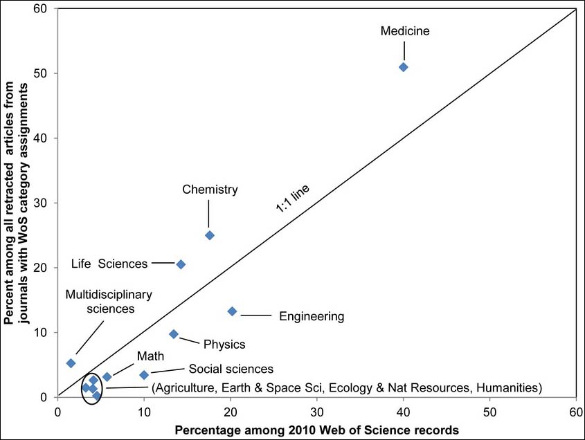 Une étude sino-américaine, publiée en octobre 2012 dans la revue PLoS One, indiquait que la médecine et la biologie sont des disciplines particulièrement exposées aux fraudes à en juger par le nombre de rétractations identifiées. Ainsi, ces deux domaines des sciences de la vie et la chimie concentrent bien plus de rétractations que d'autres disciplines scientifiques, telles que les mathématiques, les sciences de l'ingénieur, la physique, les sciences de la terre et de l'espace, l'agronomie, ou encore les sciences sociales.