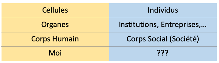 Maintenant que cela est compris, passons à une autre échelle. La société est un organisme vivant et complexe, comme le corps humain. Elle est constituée d'organes qui lui permenttent d'assumer ses fonctions basiques: banques, écoles, hopitaux, entreprises, gouvernements, Les unité de bases sont les êtres humains, nous.