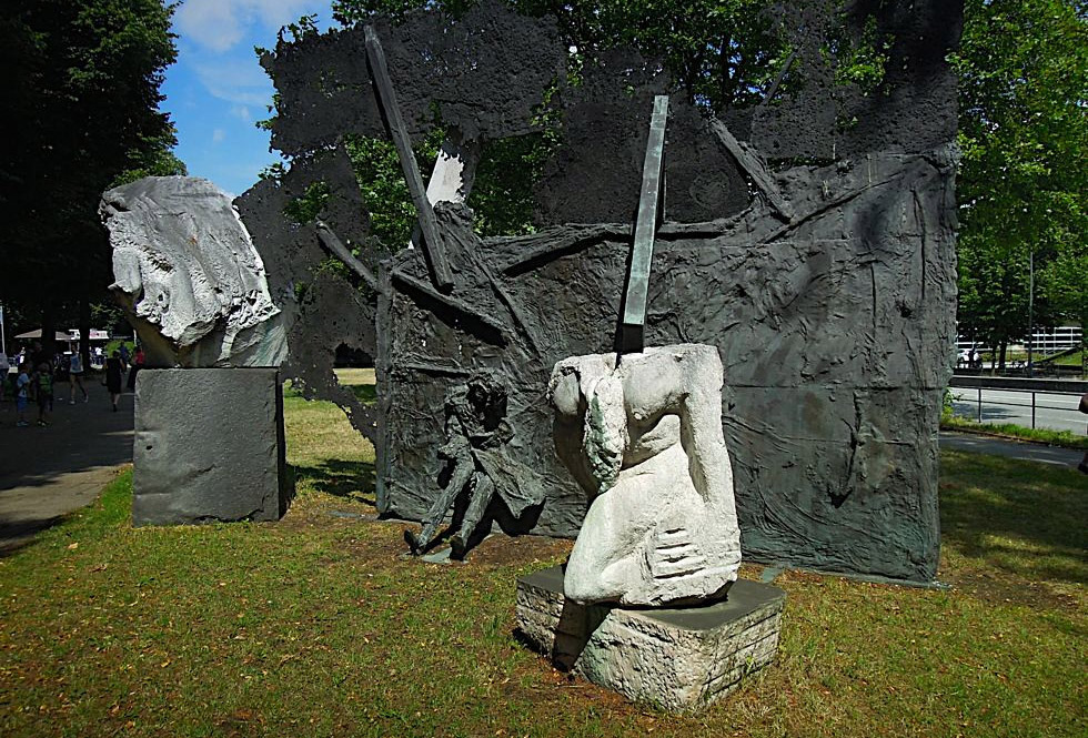 Le sculpteur autrichien Alfred Hrdlicka a été engagé pour créer un contrepoint au mémorial glorifiant la guerre. Son travail dépeint les horreurs de la guerre et comprend une référence au bombardement de l' Opération Gomorrah en juillet 1943 qui avait tué quelque 35 000 civils à Hambourg.