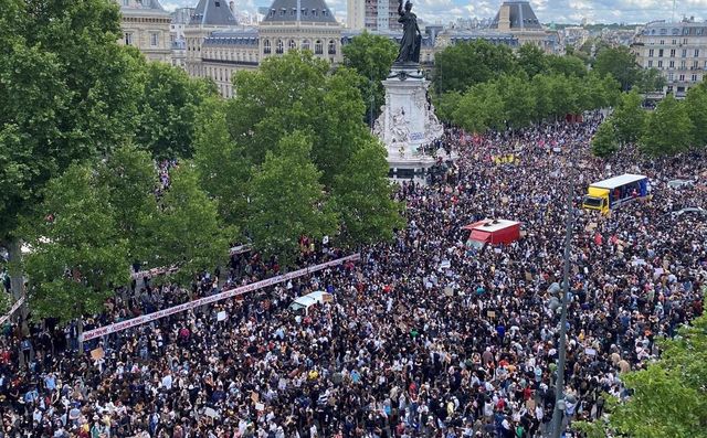 Des dizaines de milliers de personnes ont rempli la place de la République dans le centre de Paris samedi après-midi pour protester contre les violences policières et demander justice pour les meurtres de George Floyd aux États-Unis et Adama Traoré, un jeune français tué par la police lors d'une arrestation en 2016.