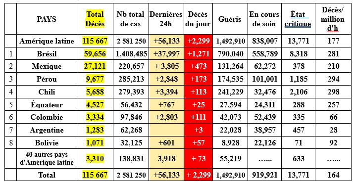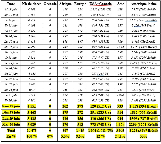 Sur les trois derniers jours le Brésil l'emporte toujours plus largement sur les USA en nombre de décès. L'Amérique latine reste toujours l'épicentre de l'épidémie et enregistre quatre fois plus de pertes que l'Amérique septentrionale (USA+Canada). Sur les 16 473 décès des quatre derniers jours, 8 228 sont latino américains, 1 994 sont US ou Canadiens et 1 419 sont européens. Mais la situation redevient préoccupante en Asie de l'Ouest avec un foyer important en Inde (+ Pakistan + Bangladesh + Arabie Saoudite + Irak). Si l'on y ajoute l'Iran et la Turquie, les pays de la région compte désormais plus de 23 % des nouveaux cas de la planète et près de 35 000 nouveaux cas/jour.