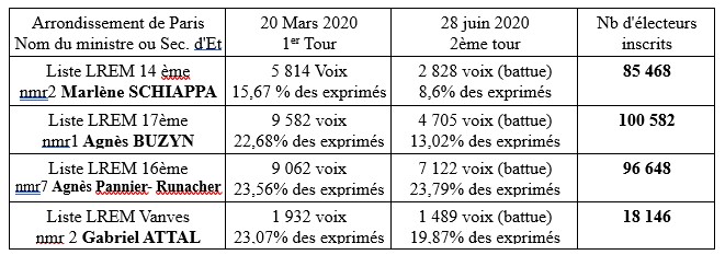 Ce qui frappe, c'est l'ampleur de la baisse entre mars et juin, sur une période de 3 mois, tant en voix qu'en pourcentage des exprimés alors qu'en règle générale, le nombre de voix et les pourcentages augmentent pour les listes qui restent au 2ème tour, dans ce genre d'élection, avec l'élimination de nombreuses listes après le 1er tour. Ce qui frappe aussi, c'est l'ampleur de la sanction appliquée par les électeurs parisiens à la liste d'Agnès BUZYN, ex-ministre de la santé. Une ampleur identique à celle de la débâcle parisienne peut être constatée partout en France et ne peut être attribuée qu'à la gestion calamiteuse de la crise Covid.
