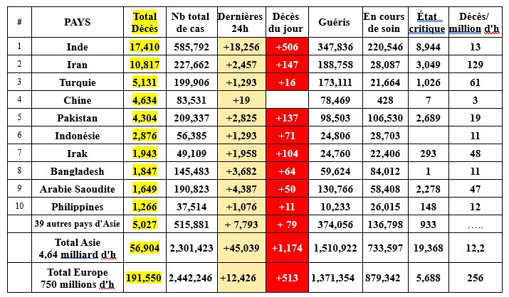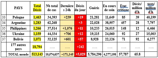 L'épidémie continue son reflux en Europe mais le virus y circule encore beaucoup: (près de 52 500 nouveaux cas en 4 jours), toujours plus d'un million de patients en cours de traitement (si l'on tient compte de ceux des 4 pays qui ne les déclarent plus: UK, Espagne, Suède et Pays Bas), près de 5 700 cas critiques (nombre qui ne diminue pas très vite...). Le virus se répand en Asie de l'Ouest (Inde, Bangladesh, Pakistan, Arabie Saoudite, Irak, Iran). Les caps des 11 millions de cas et des 525 000 décès seront franchis en fin de semaine. 25 pays ou territoires affectés par le virus sont totalement sortis d'affaire.
