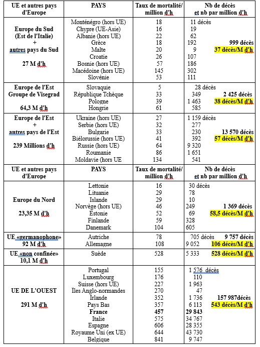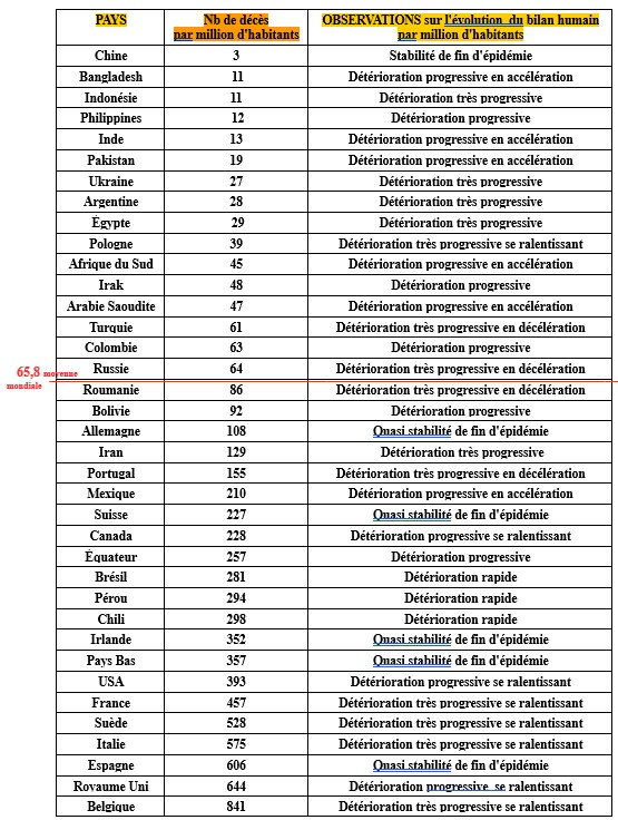 Les taux de mortalité par million d'habitants des 37 pays ayant dépassé les 1 000 décès, dans le tableau ci dessous, donne une petite idée des zones géographiques les plus touchées et/ou de la qualité de la gestion de l'épidémie par les gouvernances de chacun des états.