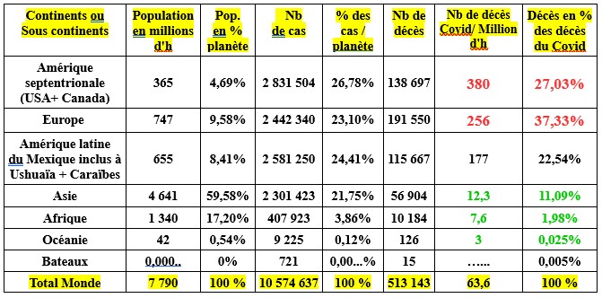 Un tableau du bilan actuel du nombre de cas et de décès par grande région du monde permet de voir, en un coup d'œil, celles qui s'en sortent bien, pour l'instant. Les continents ou sous continents sont classés par taux de mortalité Covid par million d'habitants.
