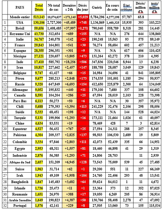 Un tableau présente ci après les bilans des 37 pays ayant déclaré plus de 1000 décès (96,3% des pertes).