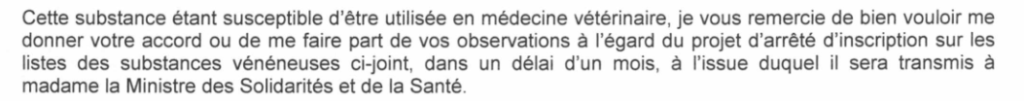 « Cette substance active n'entre pas dans la composition de médicaments vétérinaires autorisés, son classement est donc sans impact en médecine vétérinaire. »
