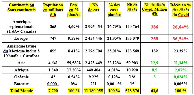 Un tableau du bilan actuel du nombre de cas et de décès par grande région du monde permet de voir, en un coup d'œil, celles qui s'en sortent bien, pour l'instant. Les continents ou sous continents sont classés par taux de mortalité Covid par million d'habitants.