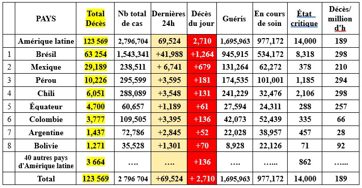 Les bilans les plus lourds de la journée d'hier restent ceux du Brésil, des USA, du Mexique et de l'Inde. Ces quatre pays ont déclaré hier, à eux seuls: 61,1% des nouveaux cas, 58,5% des nouveaux décès et 57% des cas critiques de la planète.