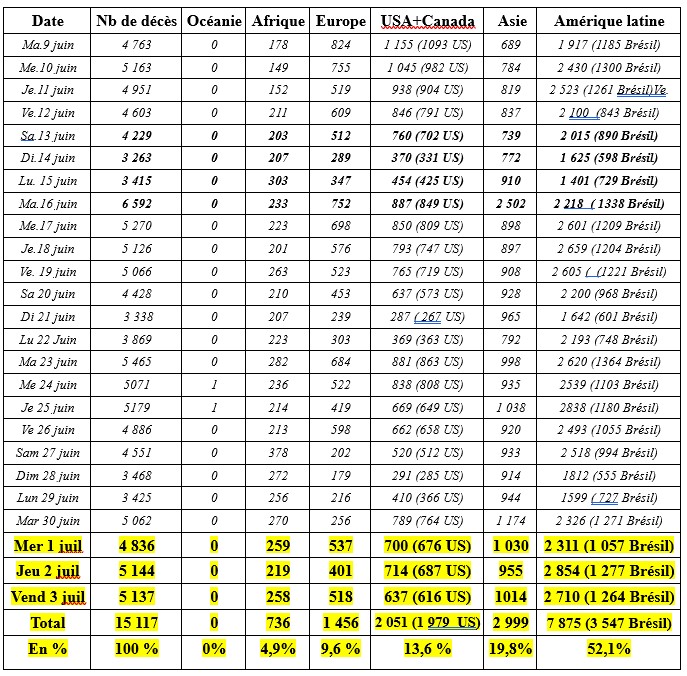 L'évolution des pertes déclarées des trois derniers jours se résume en un tableau: A sa lecture, on réalise à quel point la mortalité reste très faible en Océanie et en Afrique, à quel point elle recule en Europe et s'apaise en Amérique du Nord, à quel point elle se détériore en Amérique latine et en Asie de l'Ouest (Inde et pays voisins).