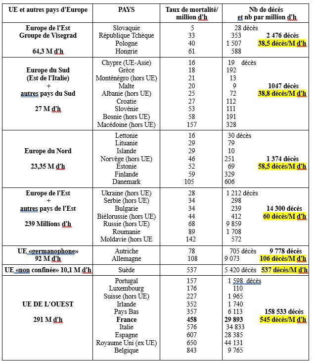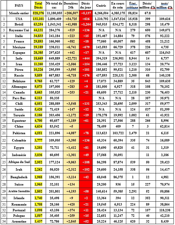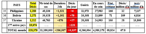 Un tableau présente ci après les bilans des 37 pays ayant déclaré plus de 1000 décès (96,3% des pertes).
