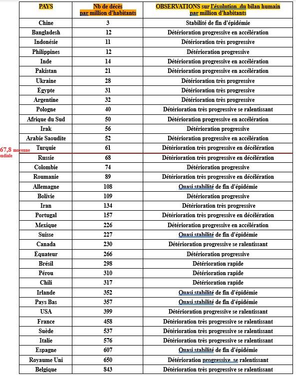 La situation de la France ne s'améliore plus vraiment. Son nombre de nouveaux cas augmente sensiblement (+ 2 159 en 3 jours). Son nombre de cas critiques baisse très légèrement. Son taux de mortalité Covid est, à ce jour, de 458 décès par million d'habitants (hors décès à domicile), pour une moyenne mondiale de 67,8. Pour le nombre des décès la France est, et restera à la troisième place des pays européens derrière le Royaume Uni et l'Italie et devant l'Espagne.