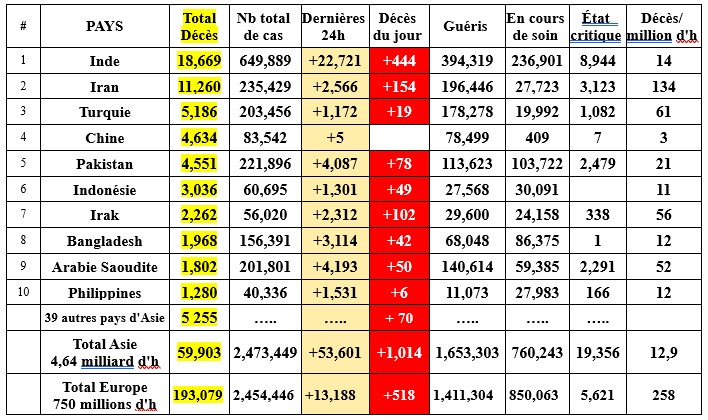 Sur les trois derniers jours le Brésil déclare presque le double des décès Covid US. L'Amérique latine reste toujours l'épicentre de l'épidémie et enregistre près de quatre fois plus de pertes que l'Amérique septentrionale (USA+Canada). Sur les 15 117 décès des trois derniers jours, 7 875 sont latino américains, 2 051 sont US ou Canadiens et 1 456 sont européens. La situation s'aggrave en Asie de l'Ouest avec un foyer important en Inde (+ Pakistan + Bangladesh + Arabie Saoudite + Irak). Si l'on y ajoute l'Iran et la Turquie, les pays de la région compte désormais plus de 20 % des nouveaux cas de la planète et plus de 40 000 nouveaux cas/jour.