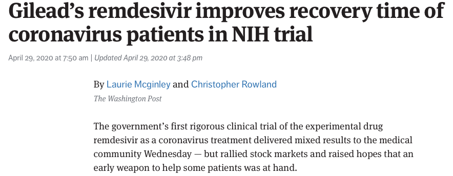 Le rapport semi-officiel du gouvernement étasunien sponsorisé par le NIH-NIAID (22 mai) intitulé Remdesivir for the Treatment of Covid-19 - Preliminary Report (NEJM) a été utilisé pour justifier un accord majeur avec Gilead Sciences Inc.