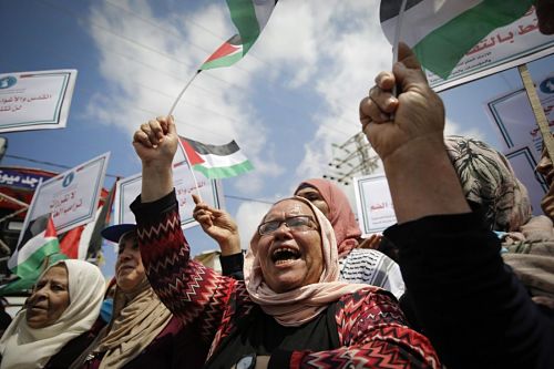Des Palestiniennes protestent contre le plan israélien d'annexion, le 6 juillet 2020, au nord de la Gaza (AFP)
