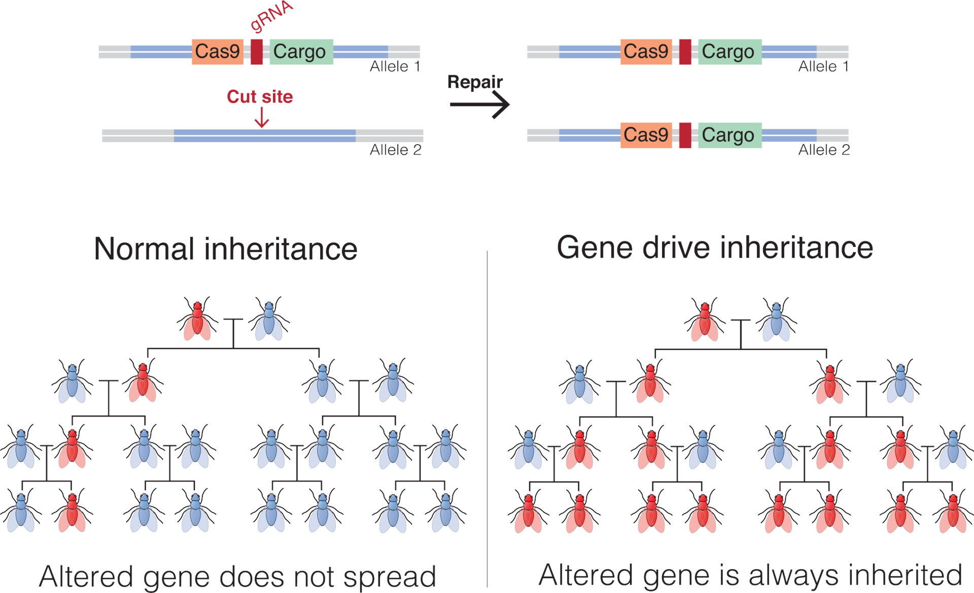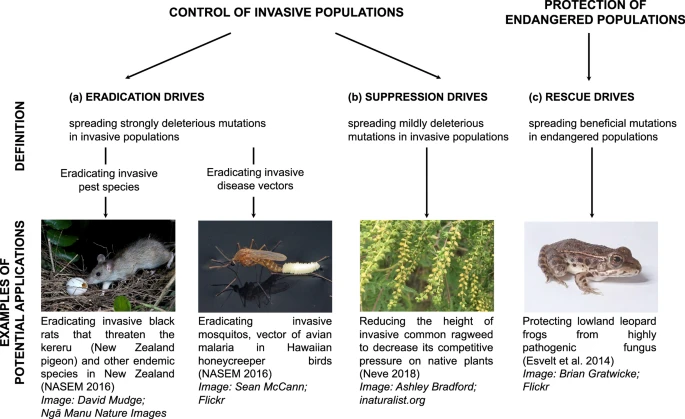 La technique peut être utilisée pour ajouter, interrompre ou modifier des gènes d'une population entière de manière à provoquer une réduction drastique de cette population en réduisant ses capacités de reproduction.