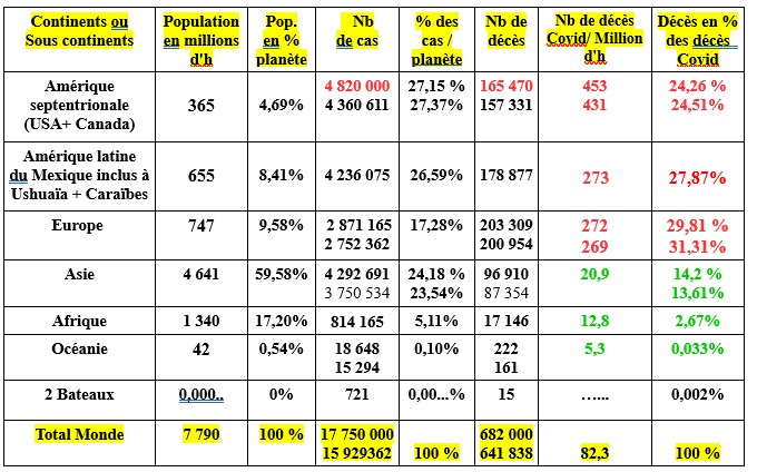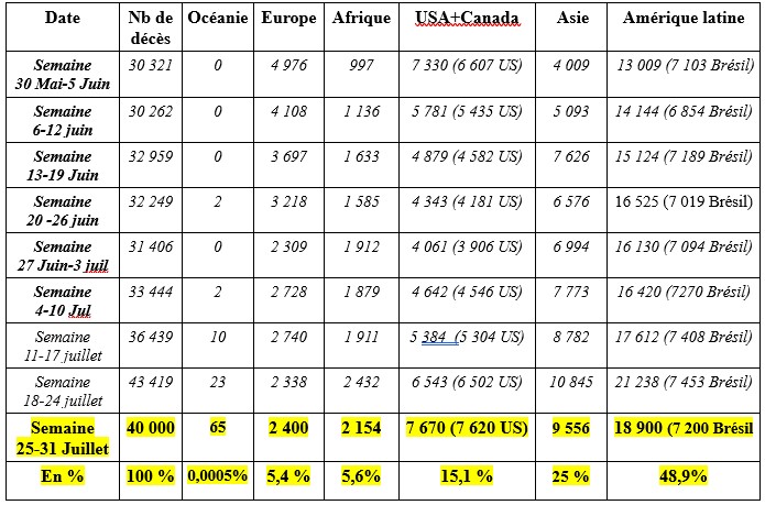 L'évolution des pertes déclarées de la semaine écoulée se résume en un tableau: A sa lecture, on réalise à quel point la mortalité reste très faible en Océanie et en Afrique, à quel point elle se réduit en Europe et rebondit aux États-Unis, à quel point elle flambe toujours en Amérique latine et se détériore encore en Asie de l'Ouest (Inde et pays voisins).