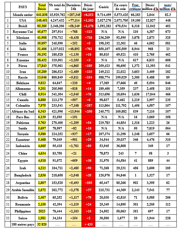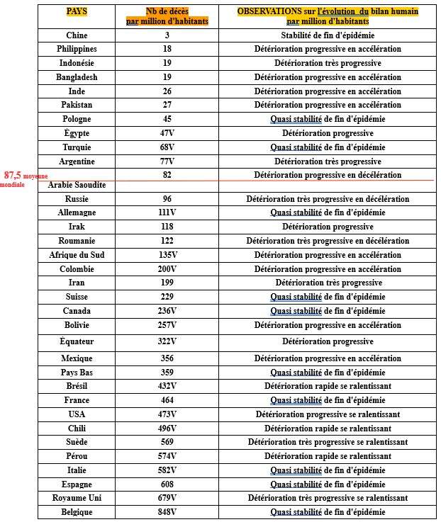 Un tableau présente ci après les bilans des 33 pays ayant déclaré plus de 2 000 décès (95% des pertes).