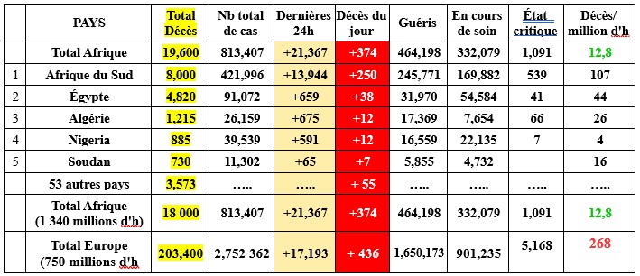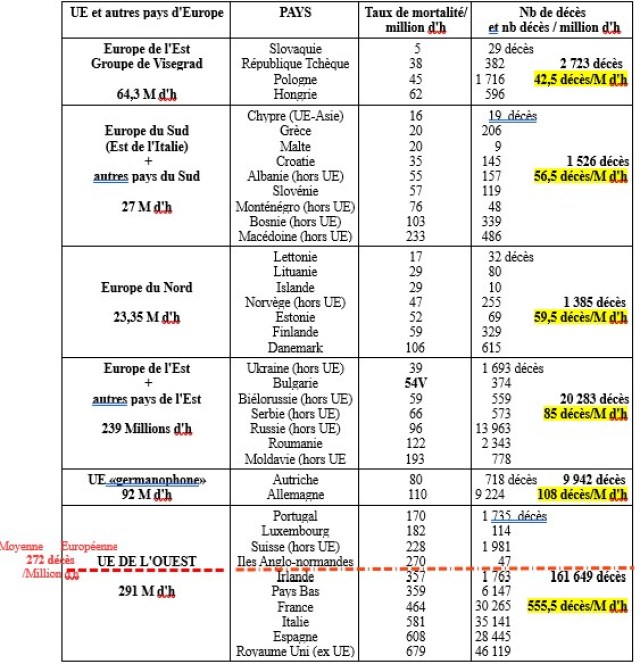 Pour la «létalité» Covid (Nb de décès /Nb de cas confirmés), la France reste «championne du monde» avec un taux de 16,2 %. (létalité Covid mondiale: 3,9%, et européenne: 7,1%). Il est vrai que, mis à part quelques exceptions locales (Marseille et Garche), la France a trop peu testé pendant trop longtemps, pris en charge trop tard de trop nombreux patients et trop compté sur le Doliprane et la «guérison spontanée» pour pouvoir espérer sauver un maximum de vies.