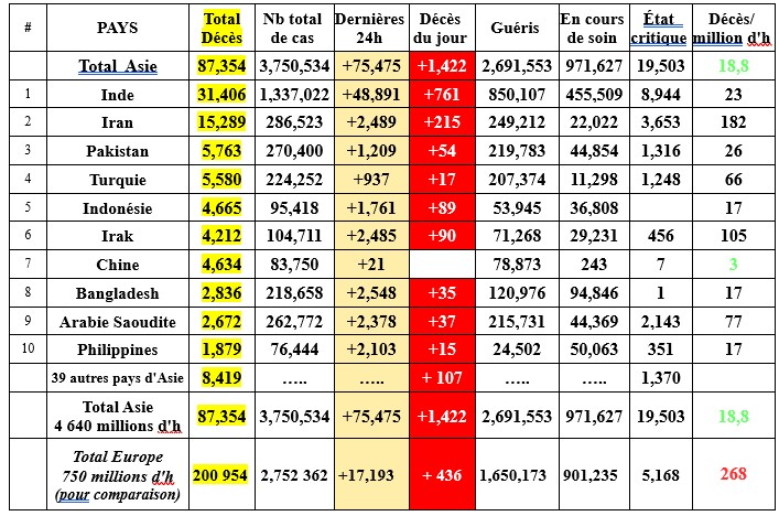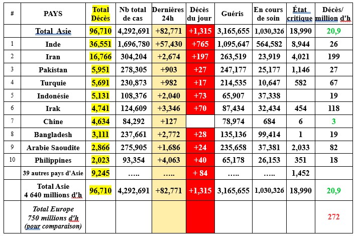 C'est l'Asie de l'Ouest (Inde, Iran et pays voisins) qui enregistrent l'essentiel des pertes en Asie. A noter que l'Iran est toujours un pays sous sanctions économiques «maximales» de la part des USA (au profit d'Israël) et que ce duo et leurs sanctions, sont, plus ou moins bien mais servilement, suivis par leurs vassaux européens (qui s'en défendent hypocritement). Le taux de mortalité Covid en Iran est sans aucun doute le moins bon d'Asie, mais les taux de mortalité par million d'habitants des bourreaux occidentaux du peuple iranien (USA, France, UK) sont deux à trois fois pires, et parmi les plus mauvais au monde...... (déjà plus de 3 fois le bilan des 7 ans de guerre du Vietnam pour les USA)...
