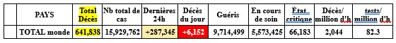 682 000 641 838 décès (+ 43 419 en 1 semaine) ; 11 100 000 9 714 499 guérisons (+ 1 296 589 en 1 semaine) ;