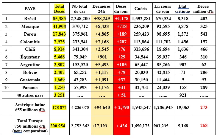 Au cours de la semaine écoulée, le Brésil a déclaré 1,15 fois le nombre des décès Covid US. L'Amérique latine reste toujours l'épicentre de l'épidémie et enregistre plus de trois fois les pertes de l'Amérique septentrionale (USA+Canada). Sur les 43 419 décès de la semaine écoulée, 21 238 sont latino-américains, 6 543 sont US ou Canadiens et 2 338 sont européens. La situation se détériore toujours plus en Asie de l'Ouest avec un foyer important en Inde (+ Pakistan + Bangladesh + Arabie Saoudite + Irak). Si l'on y ajoute l'Iran et la Turquie, les pays de la région compte désormais plus de 21 % des nouveaux cas de la planète avec près de 61 000 nouveaux cas/jour.