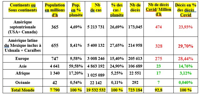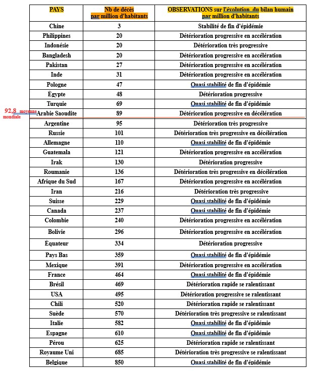 S'agissant des décès Covid, il convient de rappeler que les nombres déclarés sont très incertains..... Certains pays en développement n'ont pas les moyens de collecter des informations fiables. D'autres sous estiment le nombre de décès en oubliant, par exemple, volontairement ou non, de comptabiliser les décès à domicile, d'autres surestiment fortement ce nombre en attribuant au seul Covid, les décès de très nombreux patients souffrant de multiples pathologies (dont «le grand âge»). Plusieurs de ces pathologies, autres que la Covid ont souvent été la cause première du décès.