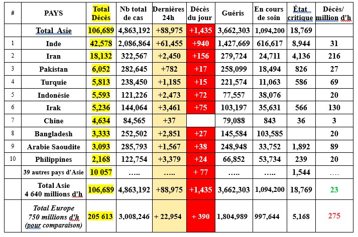 C'est l'Asie de l'Ouest (Inde, Iran et pays voisins) qui enregistrent l'essentiel des pertes en Asie. A noter que l'Iran est toujours un pays sous sanctions économiques «maximales» de la part des USA (au profit d'Israël) et que ce duo et leurs sanctions, sont, plus ou moins bien, mais servilement suivis par leurs vassaux européens (qui s'en défendent hypocritement). Le taux de mortalité Covid en Iran est, sans aucun doute, le moins bon d'Asie, mais les taux de mortalité par million d'habitants des bourreaux occidentaux du peuple iranien (USA, France, UK) sont deux à trois fois pires, et parmi les plus mauvais au monde...... (déjà plus de 3 fois le bilan des tués de toute le guerre du Vietnam pour les USA)...