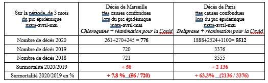 S'agissant de la surmortalité lors des trois mois du pic épidémique, il est intéressant de comparer les données récemment fournies par l'INSEE pour Marseille et Paris. Elles semblent révélatrices d'une différence sensible dans l'efficacité de la prise en charge et du traitement des patients. Il faudra bien sûr, enquêter en fin d'épidémie, par ville, par hôpital, et par protocole de traitement et publier les résultats.