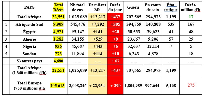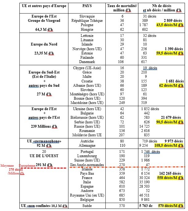 Pour la «létalité» Covid (Nb de décès /Nb de cas confirmés), la France reste «championne du monde» avec un taux de 15,32 %. (létalité Covid mondiale: 3,71%, et européenne: 6,84%). Il est vrai que, mis à part quelques exceptions locales (Marseille et Garche notamment), la France a trop peu testé pendant trop longtemps, pris en charge trop tard de trop nombreux patients et trop compté sur le Doliprane et la «guérison spontanée» pour pouvoir espérer sauver un maximum de vies.