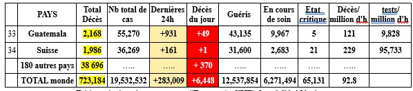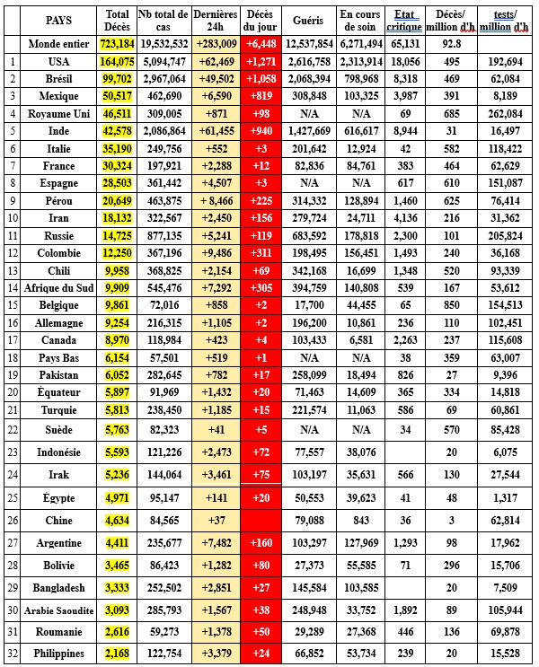 723 184 décès (+ 40 992 en 1 semaine) ; 12 537 854 guérisons (+ 1 386 526 en 1 semaine) ;