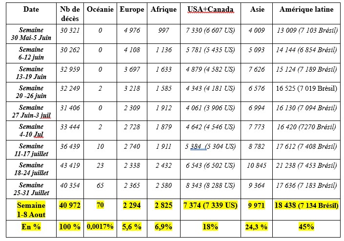 L'évolution des pertes déclarées de la semaine écoulée se résume en un tableau: A sa lecture, on réalise à quel point la mortalité reste très faible en Océanie et en Afrique, à quel point elle se stabilise en Europe et rebondit aux États-Unis, à quel point elle flambe toujours en Amérique latine et se détériore encore en Asie de l'Ouest (Inde et pays voisins).
