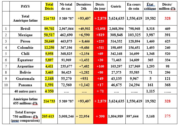 En Amérique latine, les pertes humaines se concentrent dans dix états qui déclarent 98 % des décès «latinos» et plus de 1 500 décès chacun. Les autres pays des Caraïbes et d'Amérique du Sud restent encore largement épargnés par l'épidémie.