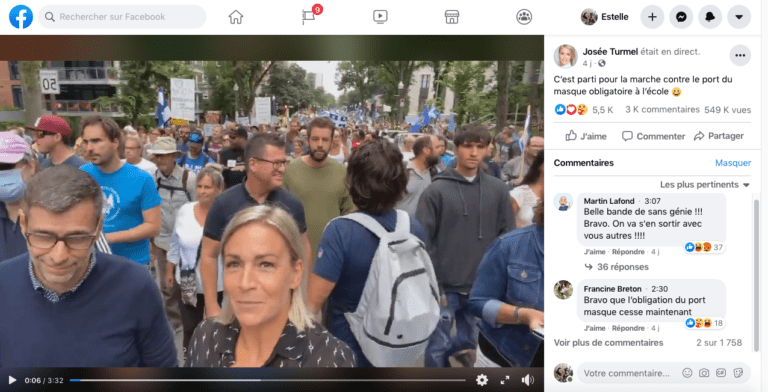 Le masque n'est pas obligatoire dans les parcs ou dans la rue, mais il est recommandé de rester à deux mètres les uns de autres et de respecter les gestes barrières. On peut lire dans le Figaro qu'un des organisateurs de la manifestation a déclaré : « Ce qui nous rassemble, c'est de dire au gouvernement de ne pas toucher à nos enfants et que le masque à dix ans ça n'a pas de sens ». Le ministre de l'éducation Jean François Roberge s'est sûrement voulu rassurant en annonçant que « les élèves de 10 ans et plus devraient porter le masque dans les transports scolaires ainsi que dans les lieux communs des écoles du Québec, mais qu'ils pourraient s'en dispenser une fois installés dans leurs classes. »