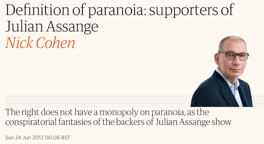 Tout cela a rendu possible ce qui s'est passé depuis. Après que l'affaire suédoise se soit évaporée et qu'il n'y ait plus de motifs raisonnables pour ne pas laisser Assange sortir de l'ambassade, les médias ont soudain décidé en chœur qu'une violation technique de la liberté sous caution était un motif suffisant pour qu'il continue à être détenu à l'ambassade - ou, mieux encore, pour qu'il soit arrêté et emprisonné. Cette violation de la liberté sous caution était bien sûr liée à la décision d'Assange de demander l'asile à l'ambassade, sur la base d'une évaluation correcte selon laquelle les États-Unis prévoyaient de demander son extradition et son emprisonnement.