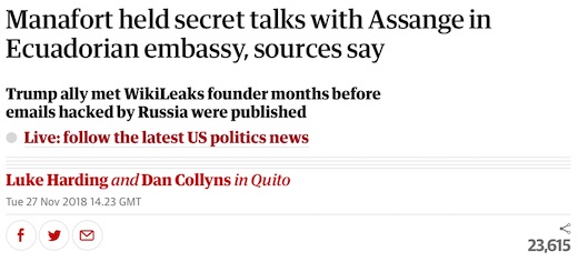La raison pour laquelle Assange et Wikileaks se sont retrouvés mêlés au fiasco du Russe - qui a gaspillé les énergies des partisans du parti Démocrate dans une campagne contre Trump qui l'a en fait renforcé plutôt qu'affaibli - est la couverture crédule, une fois de plus, de la question par presque tous les médias commerciaux. Les médias libéraux comme le journal The Guardian sont même allés jusqu'à inventer ouvertement une histoire - dans laquelle ils ont faussement rapporté qu'un assistant de Trump, Paul Manafort, et des "Russes" non nommés ont secrètement rendu visite à Assange à l'ambassade - sans répercussion ni rétractation.