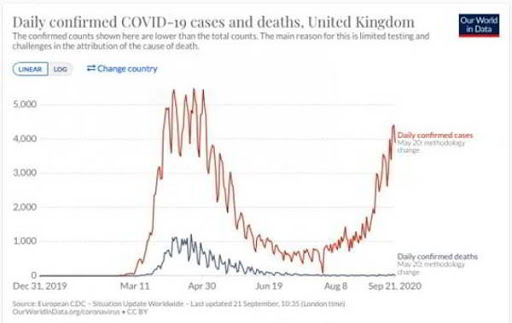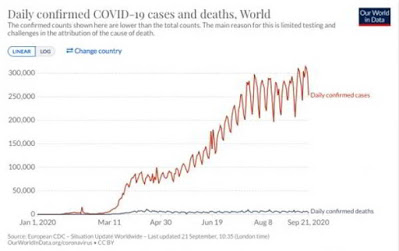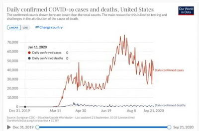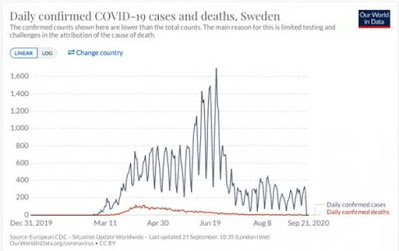 Les données relatives au Royaume-Uni, à la Suède, aux États-Unis et au monde entier montrent que dans tous les cas, les décès ont augmenté de mars à la mi- ou à la fin avril, puis ont commencé à diminuer progressivement selon une pente douce qui s'est aplatie vers la fin juin et qui se poursuit encore aujourd'hui. Cependant, les taux de cas, basés sur des tests, augmentent et oscillent de façon sauvage vers le haut et vers le bas.
