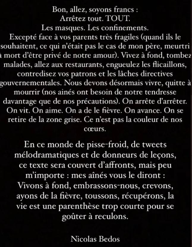 Sur son post, Nicolas Bedos ajoute : « En ce monde de pisse-froid, de tweets mélodramatiques et de donneurs de leçons, ce texte sera couvert d'affronts mais peu m'importe : mes aînés vous le diront : vivons à fond, embrassons nous, crevons, ayons de la fièvre, toussons, récupérons, la vie est une parenthèse trop courte pour se goûter à reculons. »
