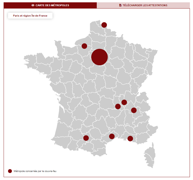 Carte des métropoles concernées par le couvre-feu, disponible sur le site du gouvernement français.