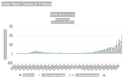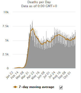 L'épidémie s'est stabilisée en Asie de l'Ouest (Inde, Bangladesh, Pakistan, Arabie Saoudite, Irak, Iran). Elle marque le pas en Afrique (Afrique du Sud, Égypte). Au rythme actuel d'évolution de l'épidémie les caps des 46 millions de cas et des 1,2 million de décès seront franchis dans la première semaine de novembre, juste après l'élection américaine. Celui des 1,5 million de décès devrait être atteint le 31 décembre 2020, ce qui représentera, à très peu près, 2,5% des décès de l'année 2020 sur la planète.