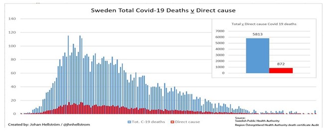 Une analyse pointue des décès suédois montre que, sur la totalité des décès déclarés «avec» le Covid seulement 16% (872 / 5813 à la date de l'étude) pouvaient être reliés au seul Covid (décès «du Covid») et non à d'autres facteurs de co-morbidité.
