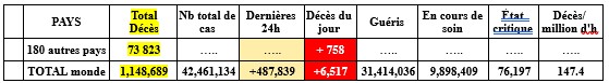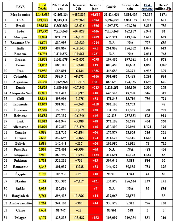 1,148,689 décès (+ 40 013 en 1 sem) ; 31,414,036 guérisons (+ 1 764 489 en 1 sem).