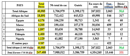 La mortalité liée au Covid y est dérisoire. A l'exception de l'Afrique du Sud, la chloroquine y a été massivement employée pour traiter les patients. Seule l'Afrique du Sud y est en situation préoccupante avec un nombre de nouveaux cas et de décès qui représentent, à eux seuls, la moitié de ceux du continent. Avec l'Égypte, le Maroc, l'Algérie, l'Éthiopie et le Nigeria, seuls autres pays d'Afrique à dépasser les 900 décès en 9 mois, elle regroupe près de 80 % des décès africains déclarés.