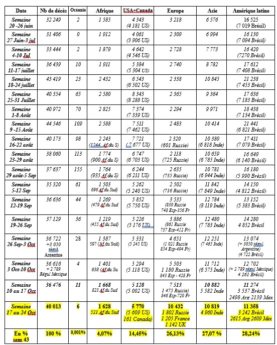 Résumé de la situation: Au niveau planétaire, si la contamination progresse principalement en Europe, la courbe générale des décès ne permet pas encore de parler de 2ème vague. La situation s'améliore ou se stabilise sur certains continents ou sous-continents (Asie, Afrique, Océanie, Amérique latine) et se détériore sur d'autres (Europe et Amérique Septentrionale qui marchent vers l'hiver). Un facteur saisonnier semble donc apparaître dans l'évolution de cette épidémie avec laquelle nous allons devoir vivre encore de longs mois, voire plusieurs années.