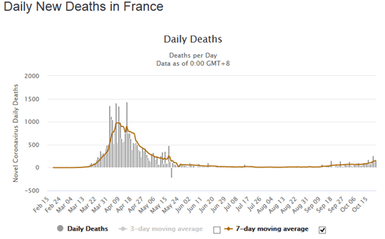 Le taux de mortalité Covid est, à ce jour, de 528 décès par million d'habitants (hors décès à domicile), pour une moyenne mondiale de 147,5. Pour le nombre des décès, la France est à la quatrième place européenne (sur 48 pays ou territoires) derrière le Royaume Uni, l'Italie et l'Espagne.