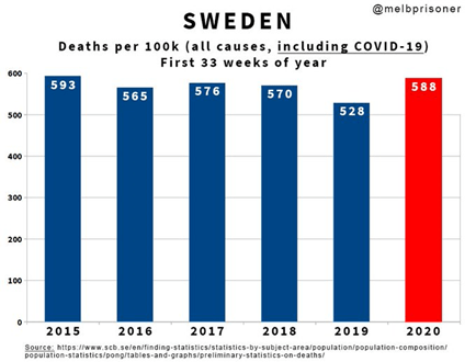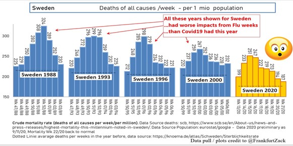 Par ailleurs, l'étude des statistiques suédoises de mortalité hebdomadaire des années où la grippe saisonnière a été la plus meurtrière montre que l'année 2020 (année Covid) n'a pas été la pire et qu'elle ne vient qu'en 5ème position derrière les années 1988, 1993, 1996 et 2000. Notons qu'à l'époque, les médias mainstream n'en faisaient pas tout un fromage, ne stressaient pas les politiques et n'hystérisaient pas les populations.......