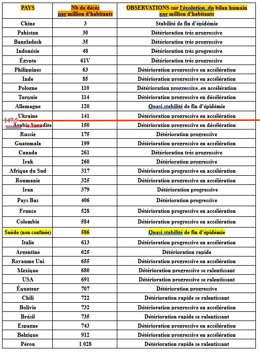 Un tableau présente ci après les bilans des 34 pays ayant déclaré plus de 3 600 décès (94% des pertes).