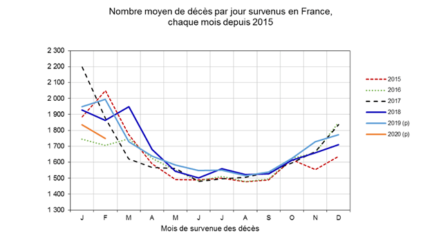 Pour décrypter correctement le tableau ci dessus, il faut garder à l'esprit que le nombre moyen de décès quotidien, en France est saisonnier. L'INSEE nous apprend qu'en moyenne, il décède 1 500 personnes/ jour en été en France et 1 800 en hiver, toutes causes confondues. Il nous apprend que la moyenne hivernale du nombre de décès peut monter jusqu'à 2200 par jour comme en Janvier 2017. Il nous apprend aussi que le nombre de décès, en France, augmente d'année en année parce qu'arrivent au grand âge - celui de la fragilité -, les générations du baby-boom.